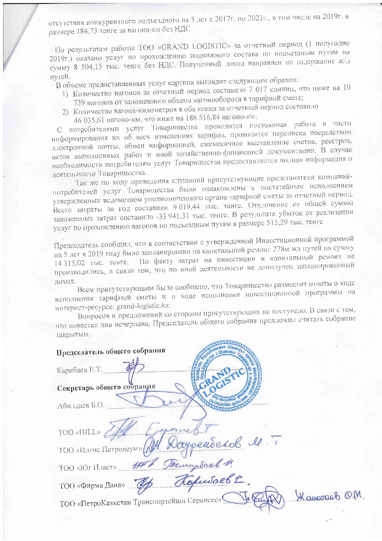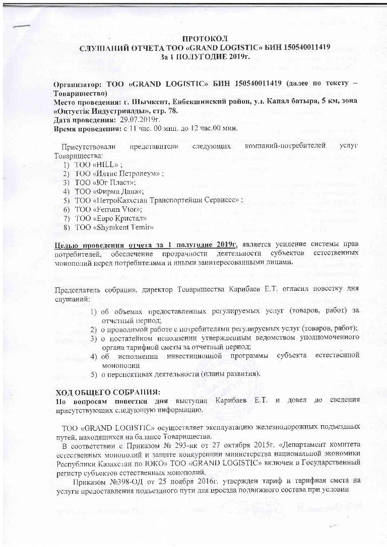 Протокол слушаний отчета ТОО ГЛ за 1 пг 2019г. - ТОО GRAND LOGISTIC