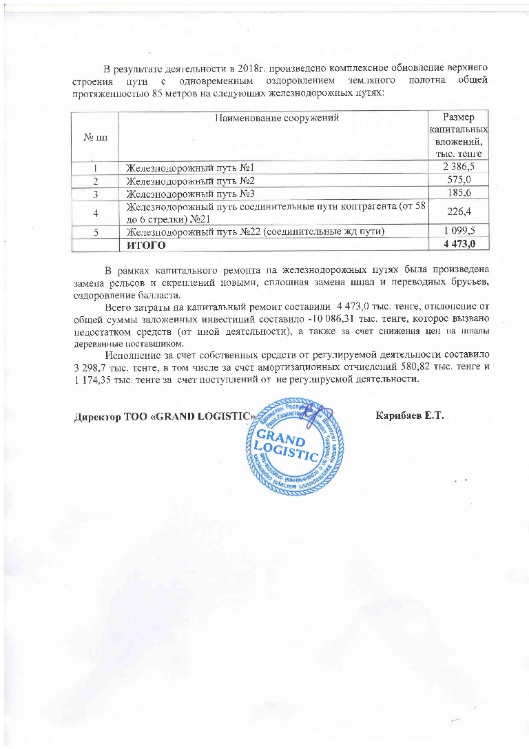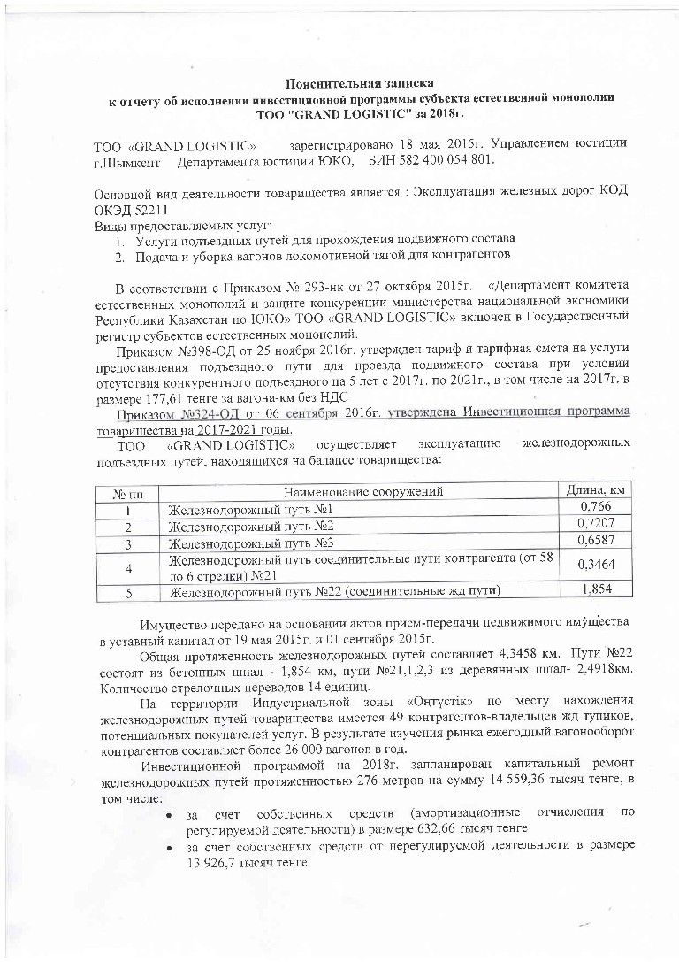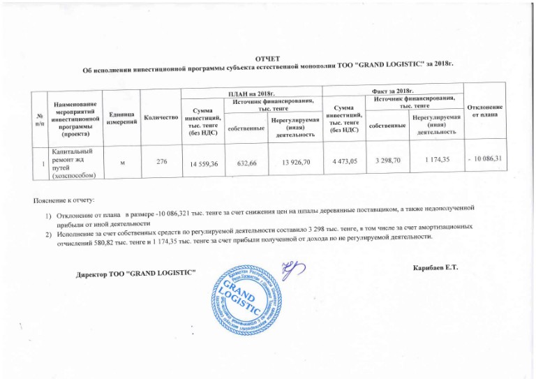 Отчет об исп-ии инвест.программы за 2018г - ТОО GRAND LOGISTIC