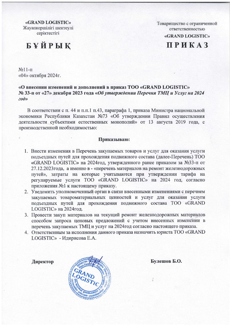 Приказ об изм приказ№33 по ТМЦ-24год - ТОО GRAND LOGISTIC