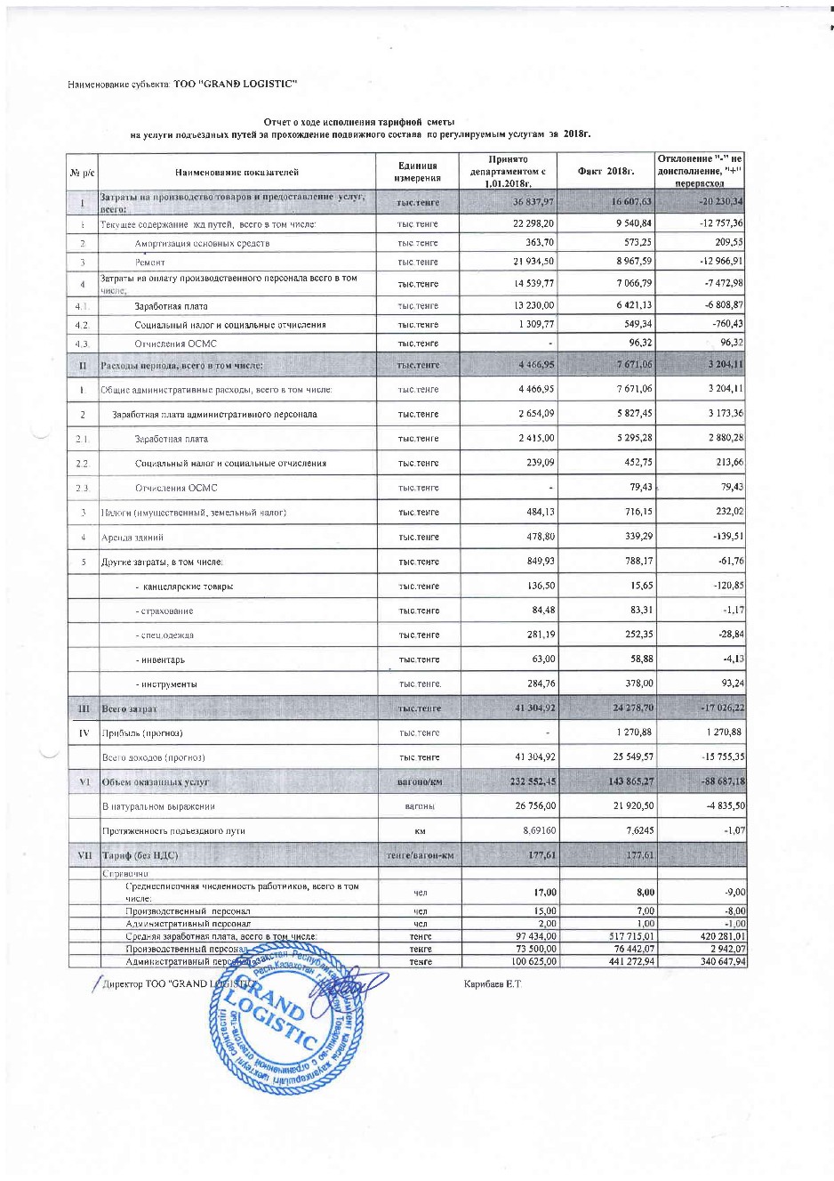 Отчет о ходе исп. тарифн. сметы - ТОО GRAND LOGISTIC