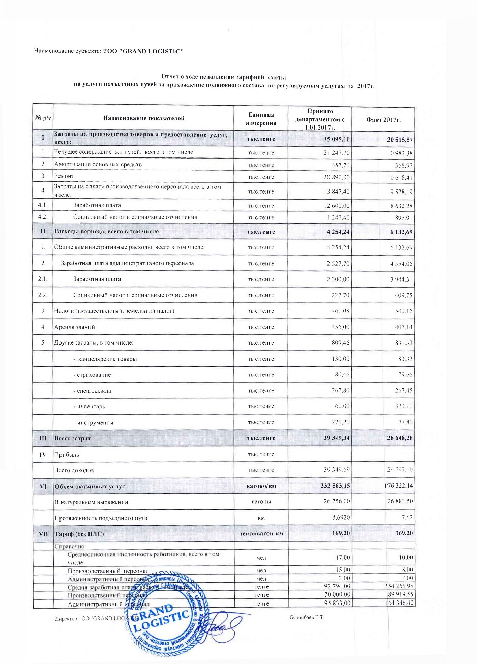 Отчет о ходе исп. тарифн. сметы - ТОО GRAND LOGISTIC