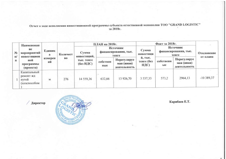 ОТЧЕТ по исп. инвест программы за 2018г. - ТОО GRAND LOGISTIC