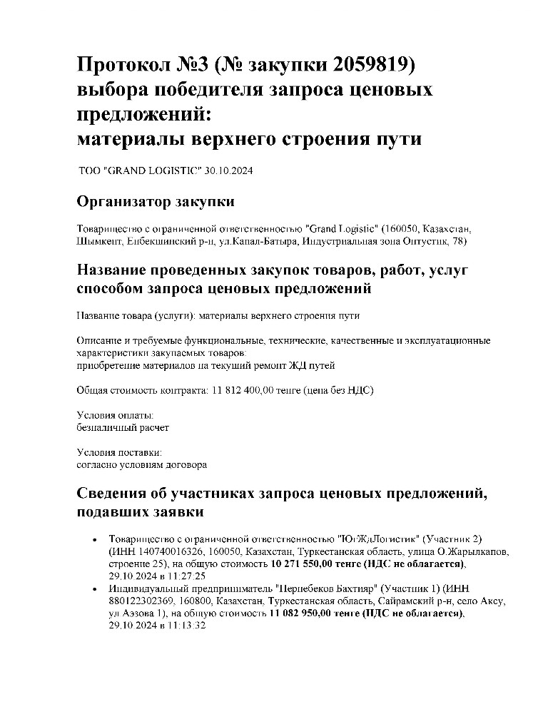 Протокол№3 итоги закупа - ТОО GRAND LOGISTIC