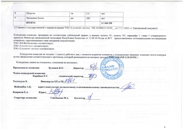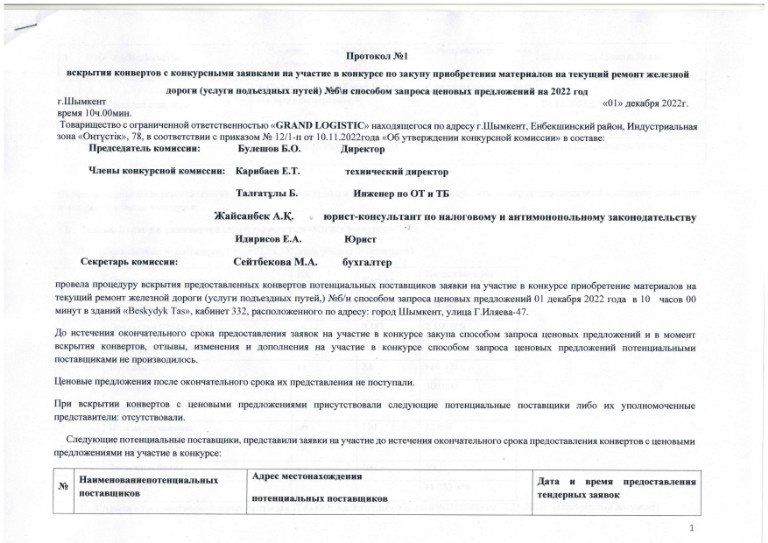 Прот-л №1 вскрытия - ТОО GRAND LOGISTIC