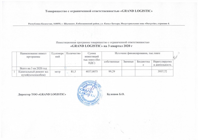 Инв.программа на 3 кв. - ТОО GRAND LOGISTIC