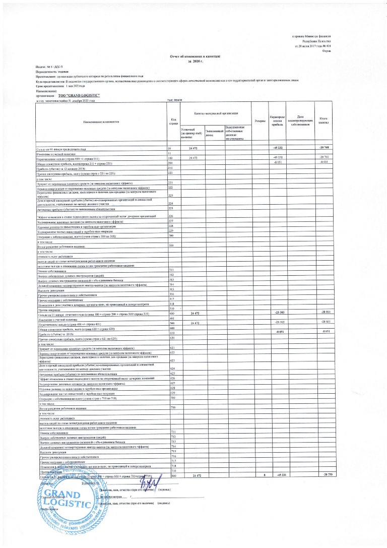 Отчет об изменениях в капитале - ТОО GRAND LOGISTIC